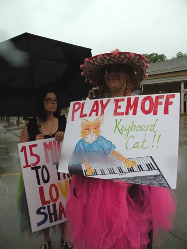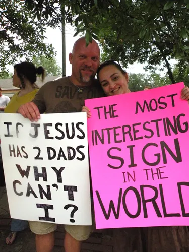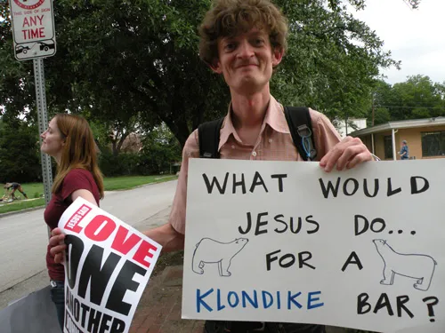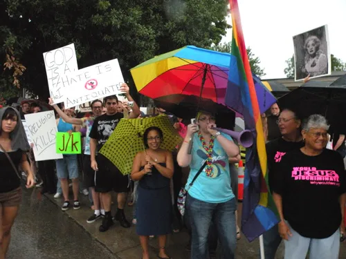 Coming all the way from Kansas to the doors of The Resource Center of Dallas to protest, hundreds of friends of our community came out to counter protest. "Hell Freezes Over" generated extreme hype, and amazingly enough, raised an undisclosed amount of funds through corporate sponsorships and donations to fix the ice machine. Great timing! Sidewalk chalk rainbow colored cobblestones were created just before the rain hit to welcome the fanatics. Perhaps the most touching was the love and humor and fellowship that radiated from the crowds standing strong in the rain, determined to shower the opposition with a greater sense of pride. You have to see the pics to believe it...