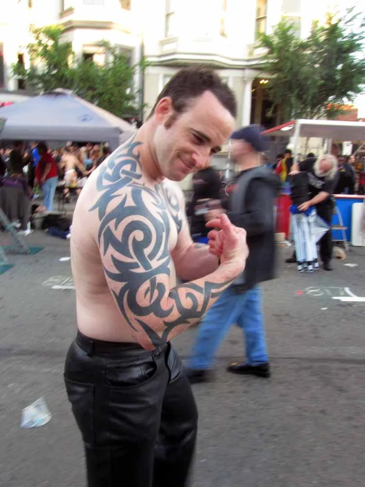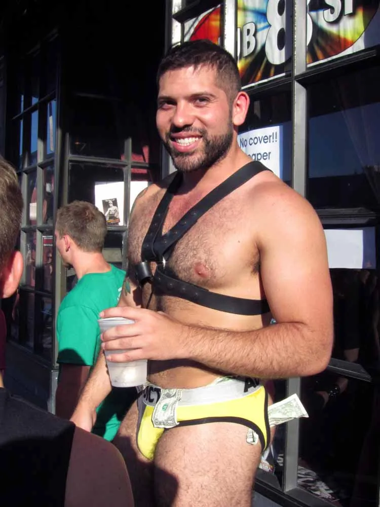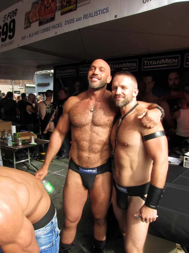Rain threatened to dampen the festivities, but by mid-afternoon the sun was out and so were half a million exhibitionists and voyeurs. Two live entertainment stages at either end bookmarked five big city blocks of beer, food, leather, and bondage gear vendors. A line-up of six DJ's kept the 10th street Gold's Gym entertainment block dancing from 11am to 6pm. The Steamworks Baths' naked twister game was popular, as were the Titan, Raging Stallion, and Man's Hands booths, where the stars were on hand to sign autographs and take pictures with fans. Spanking and whipping booths were busy and the ladies had a special place to hang at the Venus Playground. By the end of the day, the crowds thinned a bit and became even more frisky, before heading to local watering holes, one of the big after parties, or perhaps a private dungeon.